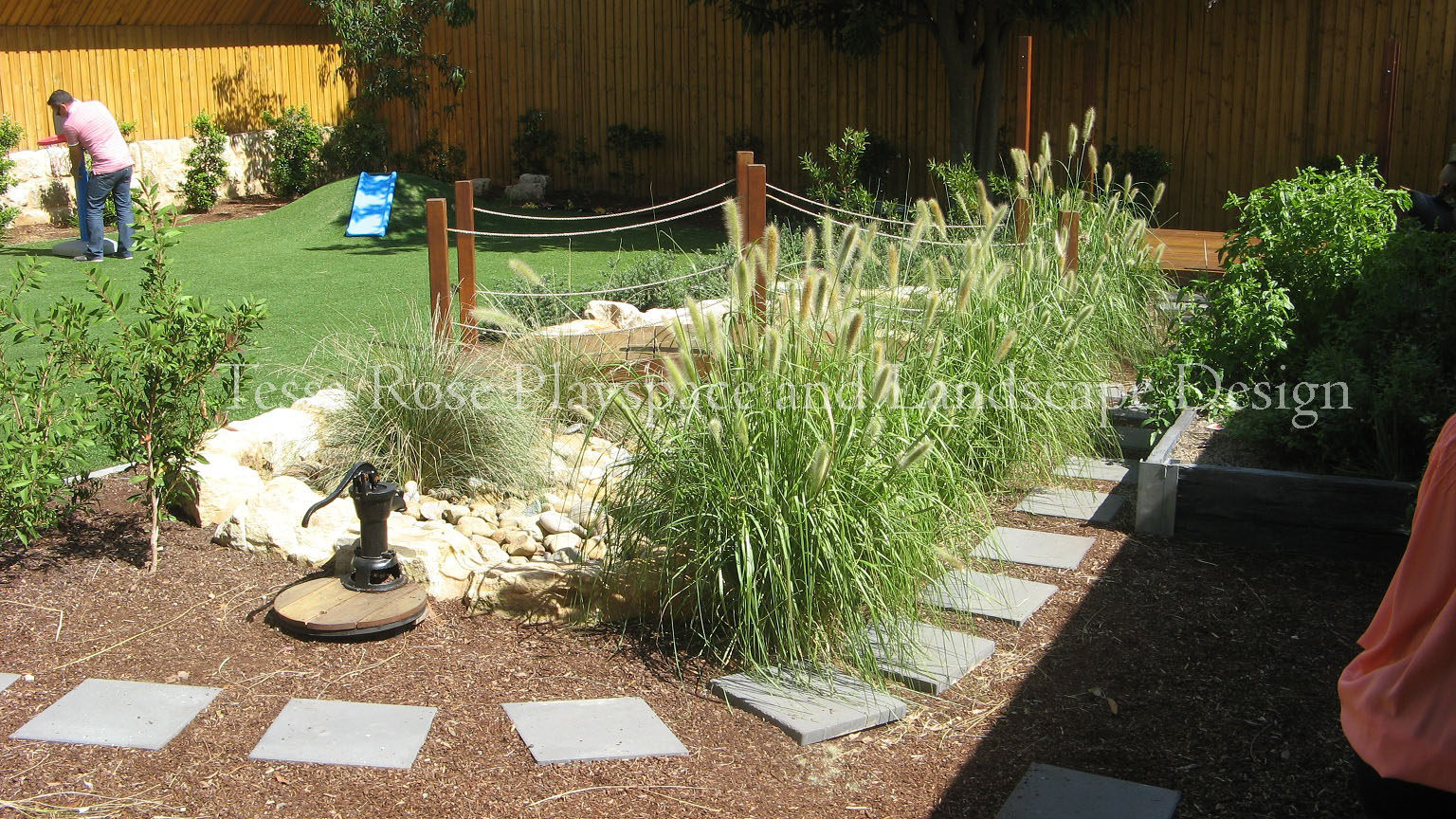 The main playspace is on the lower rear level and contains a dry creek bed (with bridge and water pump), a huge sand-play area, a slide mound, a shaded stage, balance beams, two highly utilised raised vegetable and herb garden beds and numerous naturally shaded small group spots. Various pathways of different materials link all components of the playspace. Again because of the conditions of the L&E approval, fences are of an unusual height and design to contain and diffuse any noise emanating from the area.