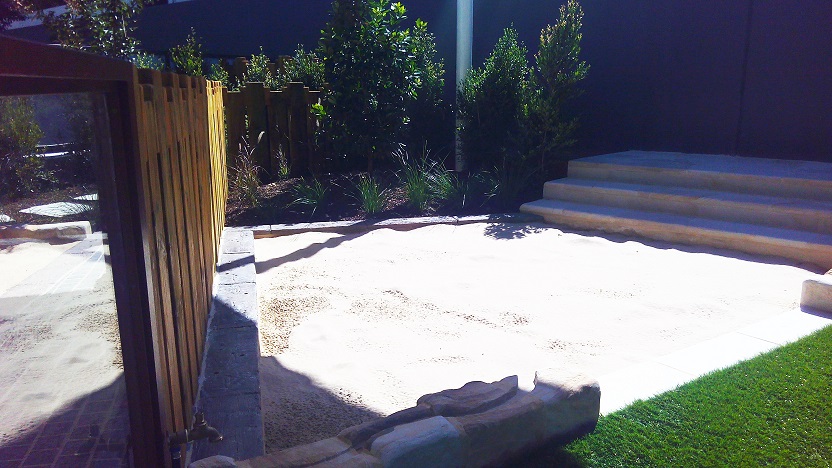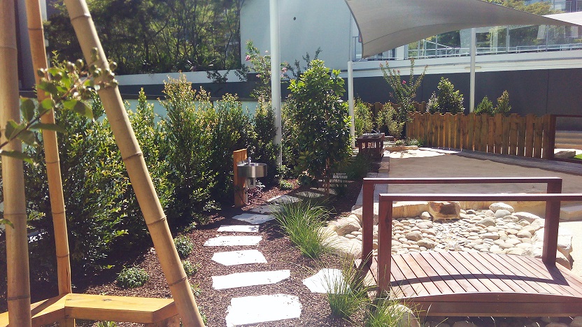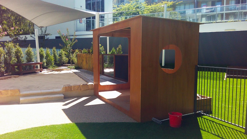 Once again it was a total pleasure working with Greg And Effie to create a design for this purpose built centre. It makes a great difference to have owners and architects who are both knowledgeable and enthusiastic to embrace the benefits of natural play environments. I have previously discussed the emergence in Sydney of centres such as this in my post Childcare playspace design response to population density changes. This centre sits within a large complex and helps to define the space, adds to the total greenspace and provides a homelike environment for children of families who live and work in the area.