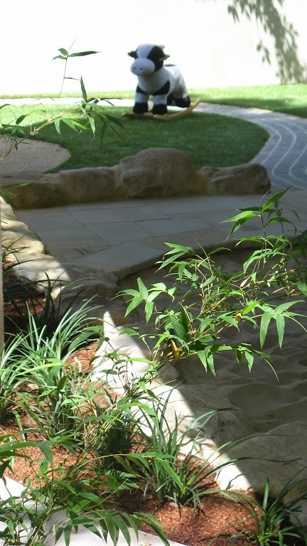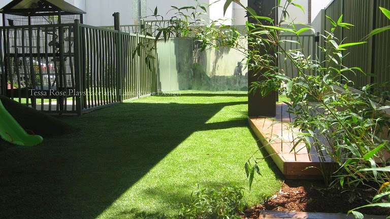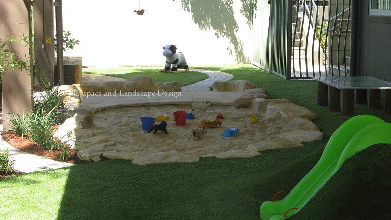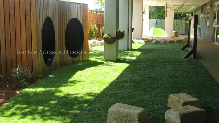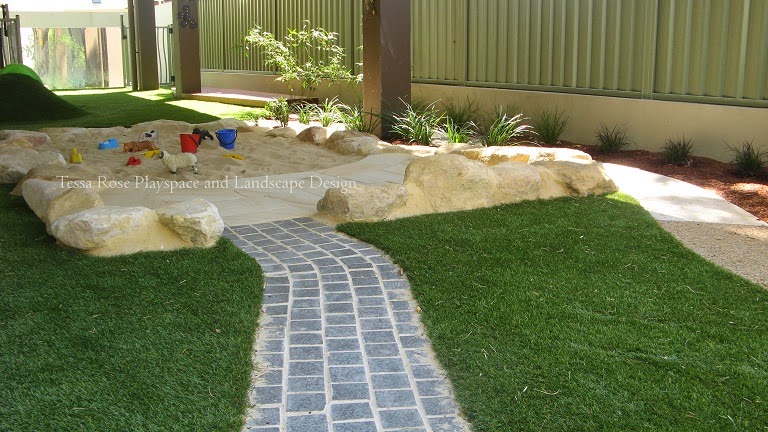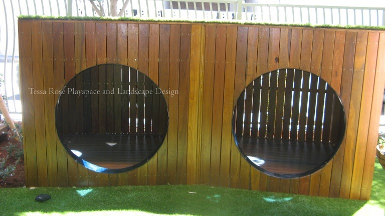 The 2-3 years area has a scaled down mound, climbing wall and double slides, timber arbors, seats and a bridge that spans a dry creek bed which in turn circles a new sandstone edged sandpit. A sandstone water channel runs along the other side of the sandpit feeding into the sandpit. A pathway interspersed with native grasses connects to the other end of the playspace where there are interconnected dual cube cubby-houses that have perspex panels to let in light and turfed roofs. A vertical perspex art panel allows for two children to engage in collaborative painting. If you look very closely you may also see where I left my camera case.